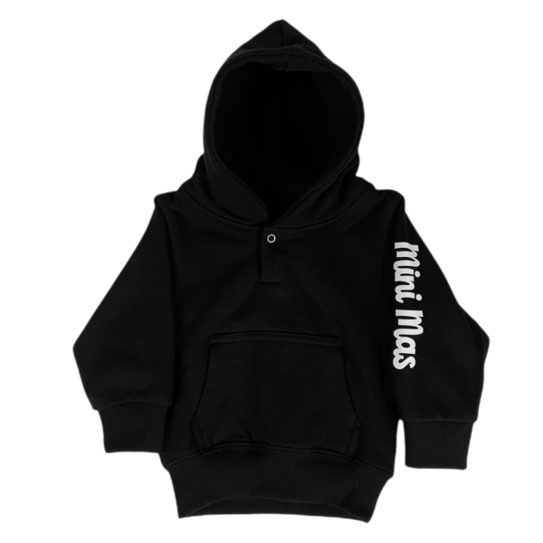 Härlig kvalitets hoodie på hela 350 GSM. Borstad mjuk insida och skön, rak modell med avslappnad passform. Stort vit textlogga på rygg. Text ”Mini Mas” på ena ärmen.